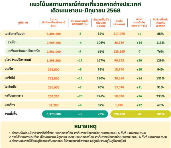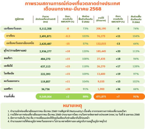 สถานการณ์การเดินทางท่องเที่ยวของนักท่องเที่ยวต่างชาติเข้าไทยระหว่างเดือนมกราคม-มีนาคม 2568 มีนักท่องเที่ยวต่างชาติจำนวน 9.55 ล้านคน เพิ่มขึ้นร้อยละ 2 และสร้างรายได้ทางการท่องเที่ยวประมาณ 4.72 แสนล้านบาท เพิ่มขึ้นร้อยละ 7 เมื่อเทียบกับช่วงเดียวกันในปี 2567 โดยจำนวนและรายได้จากนักท่องเที่ยวต่างชาติ สามารถฟื้นตัวกลับมาประมาณร้อยละ 88 และร้อยละ 91 ตามลำดับ เมื่อเทียบกับจำนวนและรายได้ที่ไทยเคยได้รับในช่วงเดียวกันของปี 2562