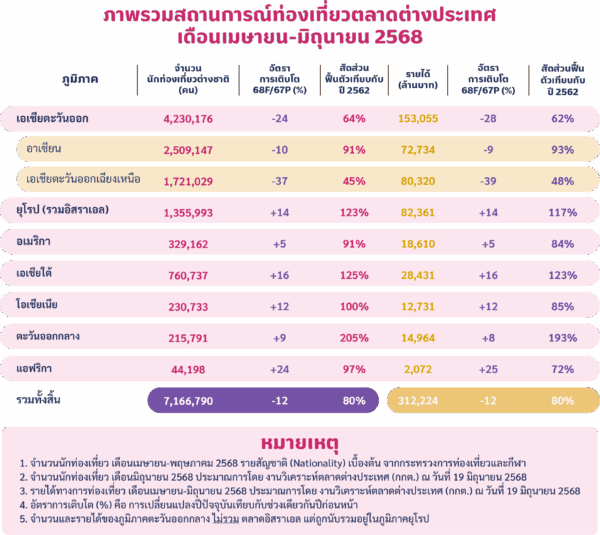 สถานการณ์การเดินทางท่องเที่ยวของนักท่องเที่ยวต่างชาติเข้าไทยระหว่างเดือนเมษายน-มิถุนายน 2568 มีนักท่องเที่ยวต่างชาติจำนวน 7.17 ล้านคน ลดลงร้อยละ 12 และสร้างรายได้ทางการท่องเที่ยวประมาณ 3.12 แสนล้านบาท ลดลงร้อยละ 12 เมื่อเทียบกับช่วงเดียวกันในปี 2567 โดยทั้งจำนวนและรายได้จากนักท่องเที่ยวต่างชาติ สามารถฟื้นตัวกลับมาประมาณร้อยละ 80 เมื่อเทียบกับจำนวนและรายได้ที่ไทยเคยได้รับในช่วงเดียวกันของปี 2562 และเมื่อเทียบกับช่วงไตรมาสแรกปี 2568 (เดือนมกราคม-มีนาคม 2568) ลดลงร้อยละ 25 เนื่องจากเข้าสู่ช่วงนอกฤดูกาลท่องเที่ยวไทย Low Season และตลาดหลักเอเชียทุกตลาดลดลงต่อเนื่อง