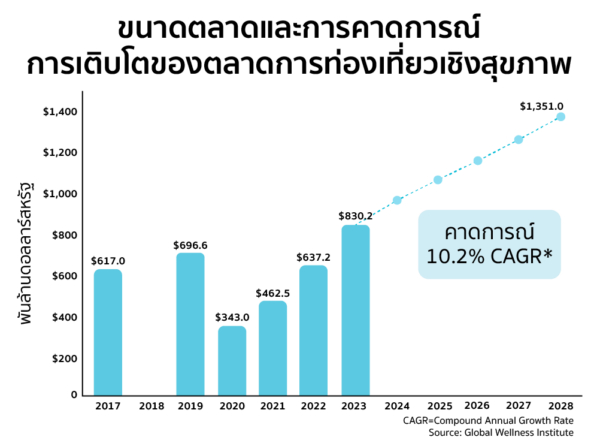 ปัจจุบันตลาดการท่องเที่ยวเชิงสุขภาพมีบทบาทสำคัญและได้รับความสนใจเพิ่มขึ้นหลังสถานการณ์การแพร่ระบาดของโควิด-19 โดย Global Wellness Institute (GWI) คาดการณ์ว่าอุตสาหกรรมท่องเที่ยวเชิงสุขภาพ (Wellness Tourism) ทั่วโลก จะมีมูลค่าตลาดสูงถึง 1,351 พันล้านดอลลาร์สหรัฐ (ราว 43 ล้านล้านบาท) ภายในปี 2028 ด้วยอัตราการเติบโตเฉลี่ย (CARG) 10.2% ระหว่างช่วงปี 2023-2028