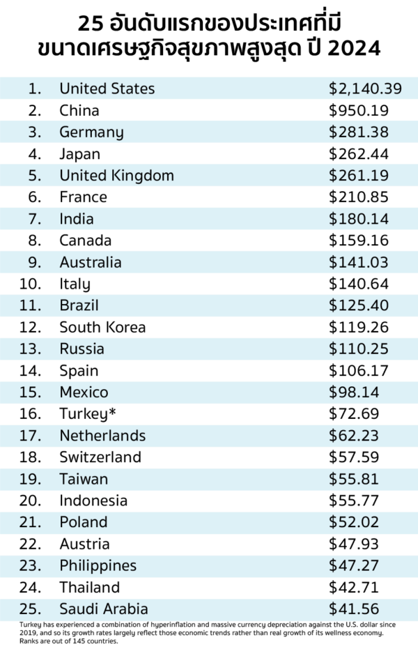 ข้อมูล “25 อันดับแรกของประเทศที่มีขนาดเศรษฐกิจสุขภาพสูงสุด” ตามรายงานของ Global Wellness Institute 2024 สะท้อนถึงมูลค่ารวมของเศรษฐกิจสุขภาพ (Wellness Economy) ของแต่ละประเทศ ซึ่งรวมถึงการใช้จ่ายด้านการท่องเที่ยวเชิงสุขภาพ โภชนาการ การออกกำลังกาย และการแพทย์แบบองค์รวม โดยมีหน่วยเป็นพันล้านดอลลาร์สหรัฐ