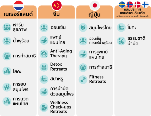 ที่มาข้อมูล: โครงการศึกษาพฤติกรรมเชิงลึกของนักท่องเที่ยวต่างประเทศกลุ่มการท่องเที่ยวเชิงสุขภาพ(Wellness Tourism) (การท่องเที่ยวแห่งประเทศไทย)