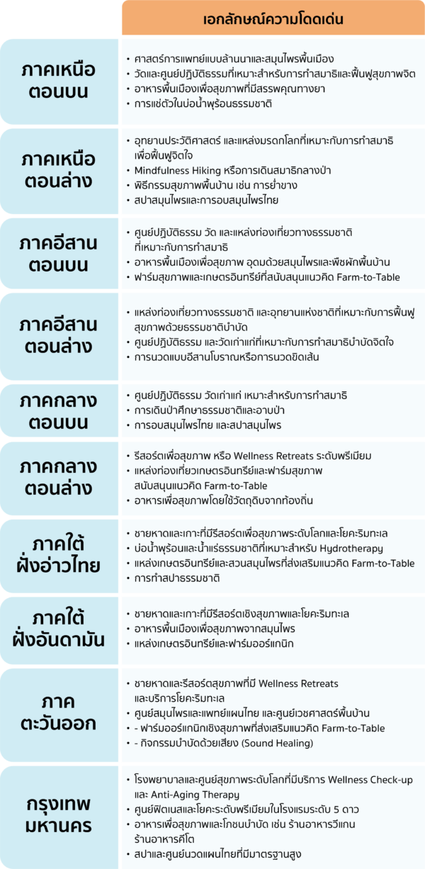 ในการดำเนินโครงการศึกษาพฤติกรรมเชิงลึกของนักท่องเที่ยวต่างประเทศกลุ่มการท่องเที่ยวเชิงสุขภาพ (Wellness Tourism) มีการศึกษาข้อมูลทั้งจากข้อมูลเชิงวิชาการที่เกี่ยวข้อง ข้อมูลในมิติของอุปทานด้านการท่องเที่ยว (Supply Side) เพื่อวิเคราะห์ศักยภาพหรือความโดดเด่นของสินค้าและบริการด้านการท่องเที่ยวเชิงสุขภาพของประเทศไทยในแต่ละภูมิภาค และอุปสงค์การท่องเที่ยว (Demand Side) เพื่อศึกษาพฤติกรรมและความต้องการด้านสินค้าและบริการของนักท่องเที่ยวต่างประเทศกลุ่มการท่องเที่ยวเชิงสุขภาพ ซึ่งการวิเคราะห์ข้อมูลที่ครอบคลุมในหลายมิตินี้จะช่วยสะท้อนภาพรวมอุตสาหกรรมการท่องเที่ยวเชิงสุขภาพของประเทศไทยได้ชัดเจน ส่งผลให้สามารถพัฒนาสินค้าและบริการด้านสุขภาพที่สอดคล้องกับความต้องการของนักท่องเที่ยวได้อย่างเหมาะสม โดยสามารถสรุปเอกลักษณ์หรือความโดดเด่นของการท่องเที่ยวเชิงสุขภาพในประเทศไทย และกิจกรรมเชิงสุขภาพที่นักท่องเที่ยวแต่ละประเทศให้ความสนใจได้ดังนี้