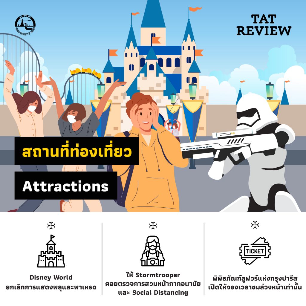 – Disney Springs ให้ Stormtrooper ตัวละครทหารฝ่ายร้ายจากภาพยนตร์ เรื่อง Star Wars คอยตรวจการสวมหน้ากากอนามัยและ Social Distancing ของนักท่องเที่ยว